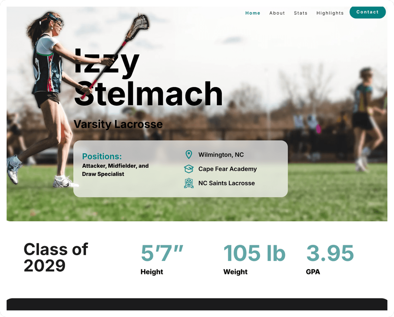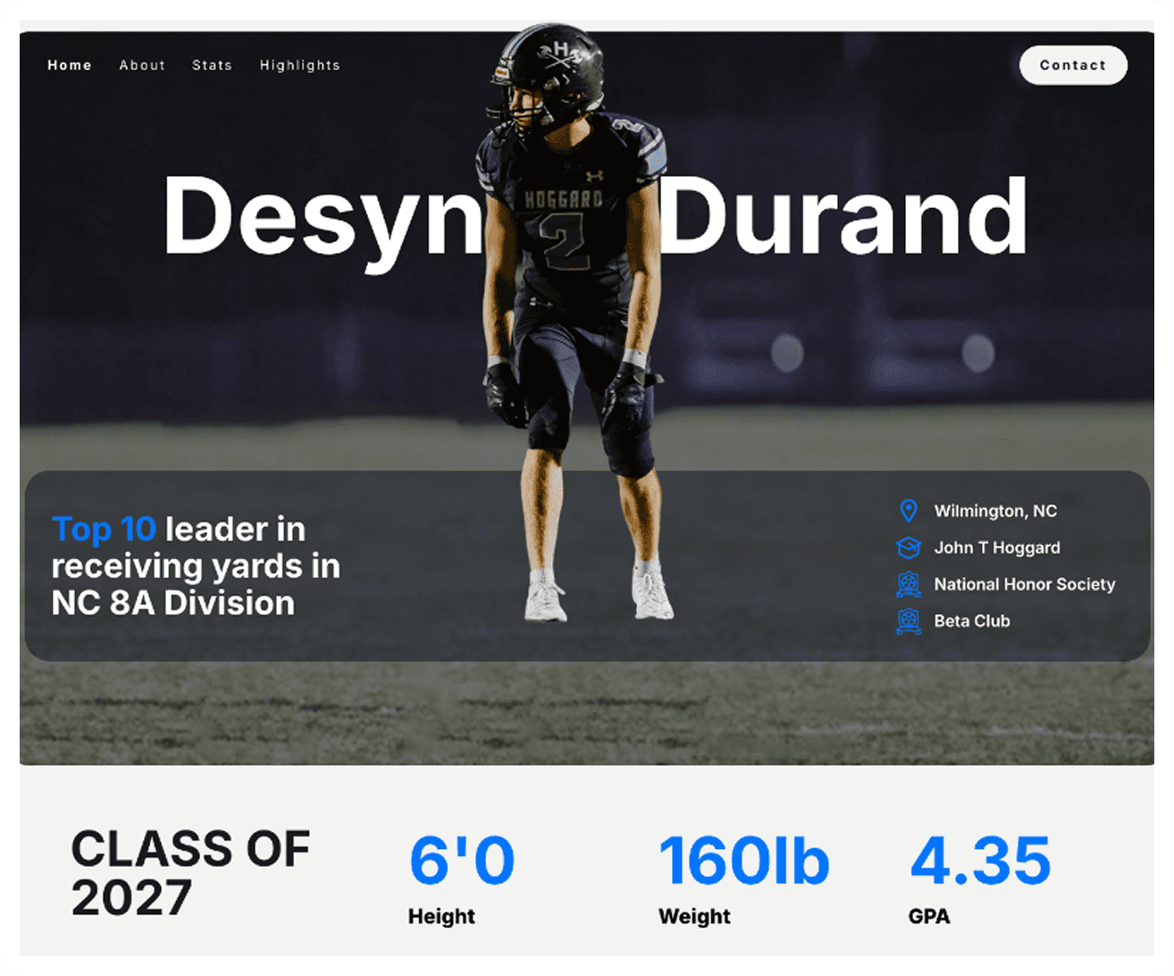 Your website launches on your custom domain, fully optimized and mobile-ready. Share your one professional link with coaches and start your recruiting journey.